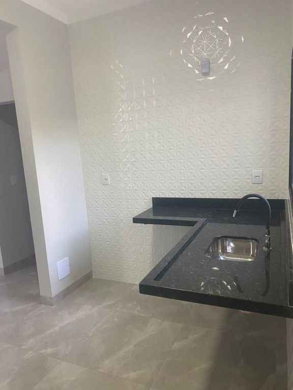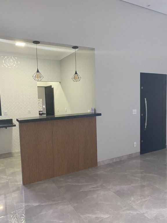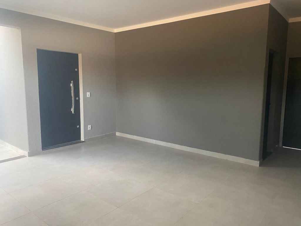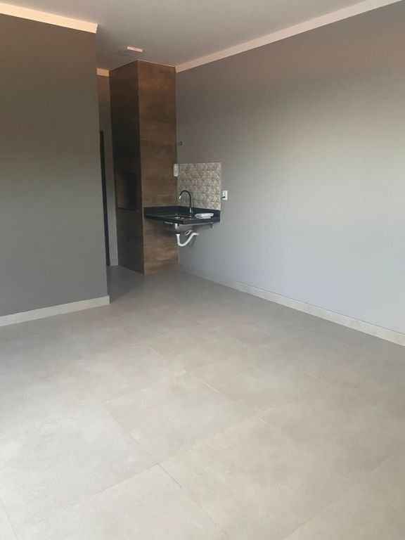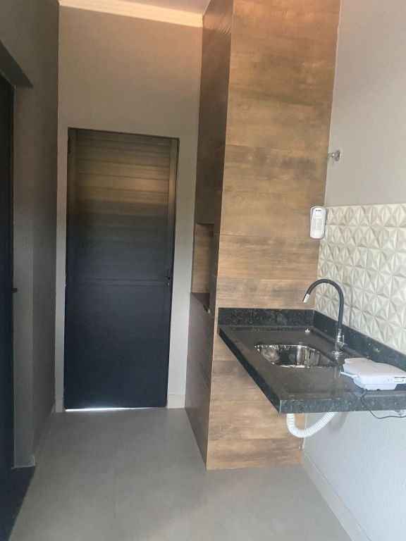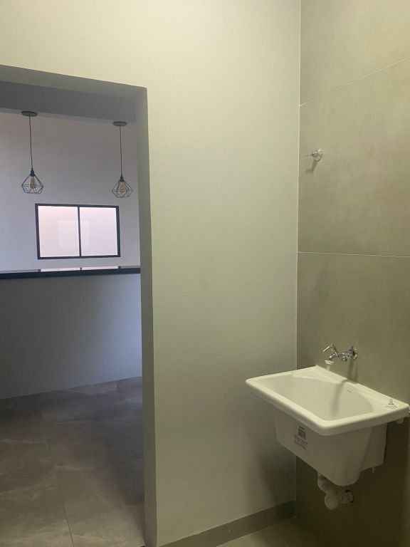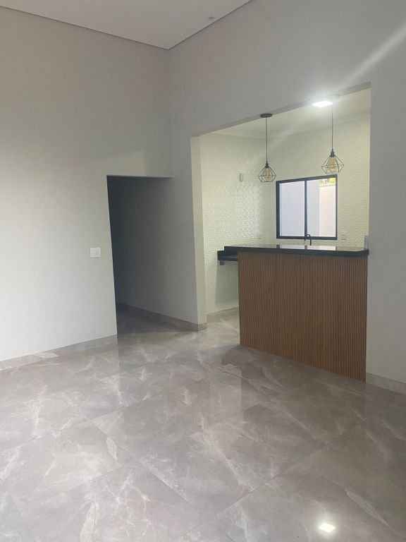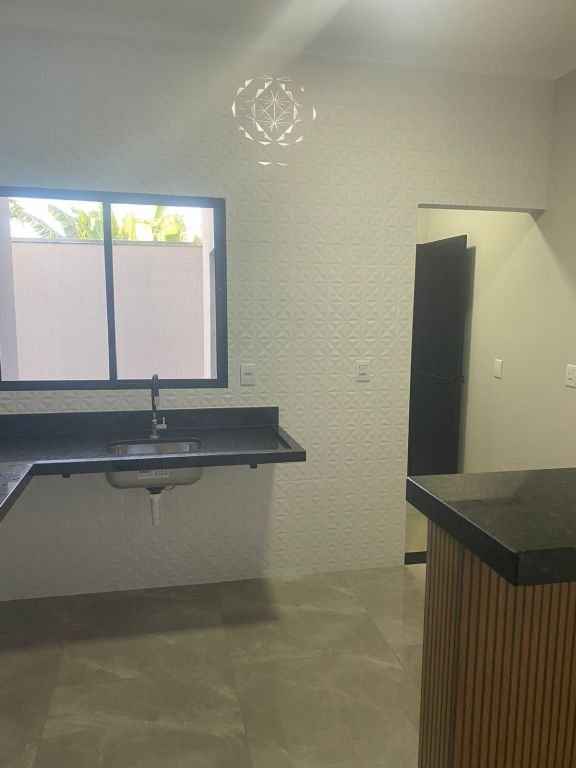 Residencial padrão novo, fino acabamento, pé direito alto, com 3 quartos sendo um suite, sala, cozinha americana, lavanderia, churrasqueira e garagem com portão eletronico.
