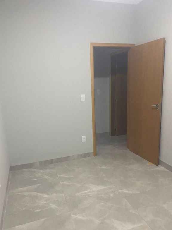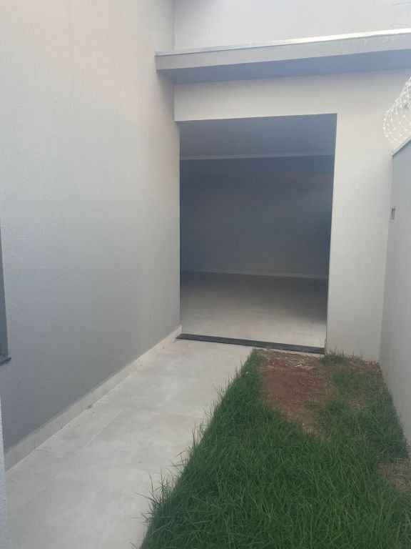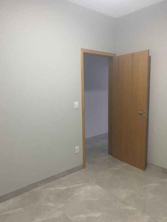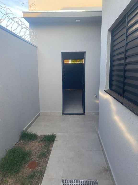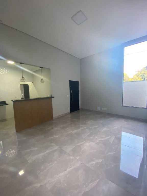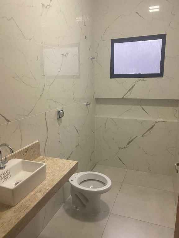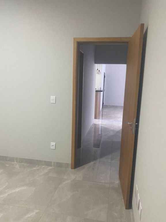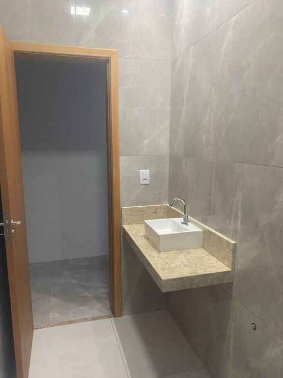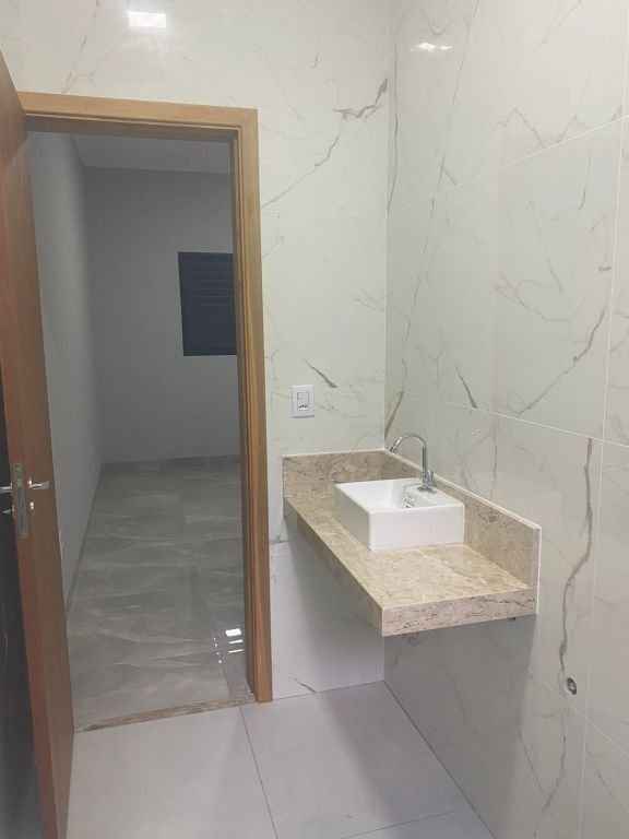 Residencial padrão novo, fino acabamento, pé direito alto, com 3 quartos sendo um suite, sala, cozinha americana, lavanderia, churrasqueira e garagem com portão eletronico.