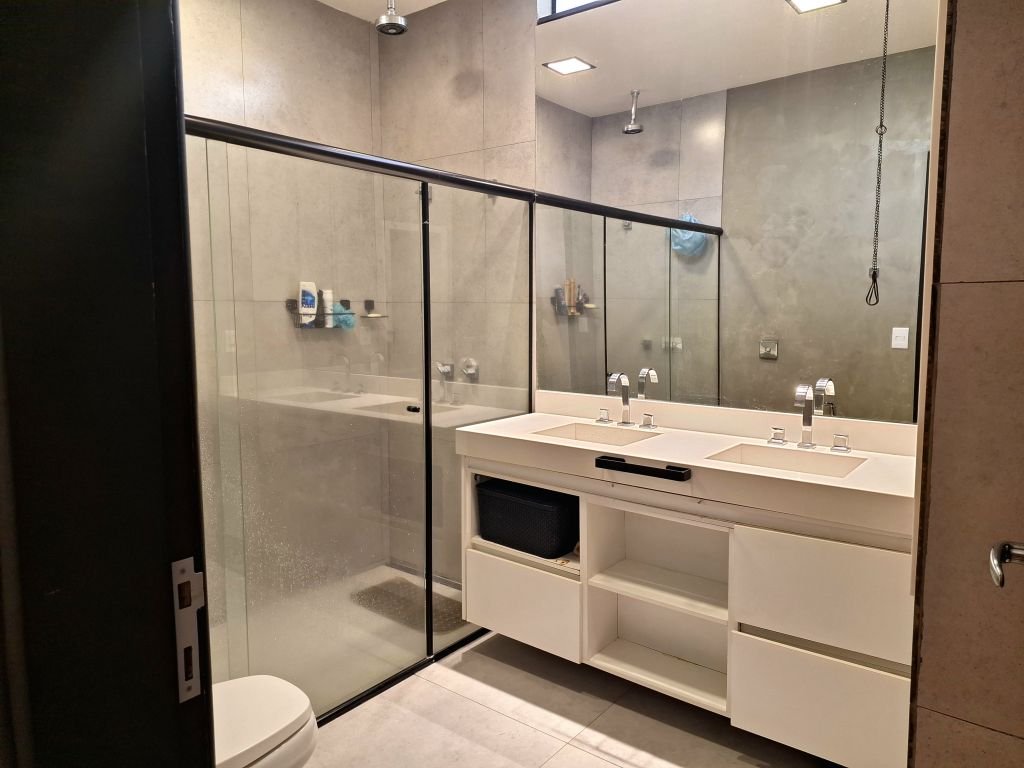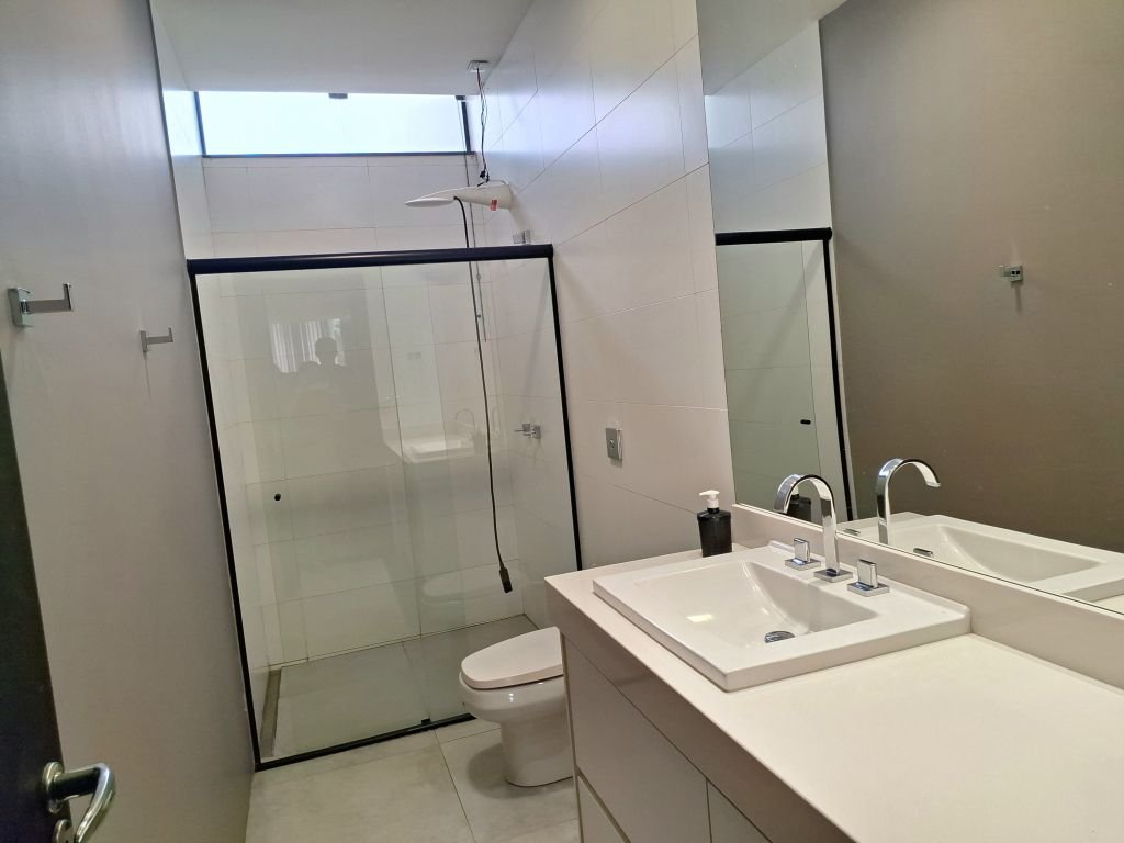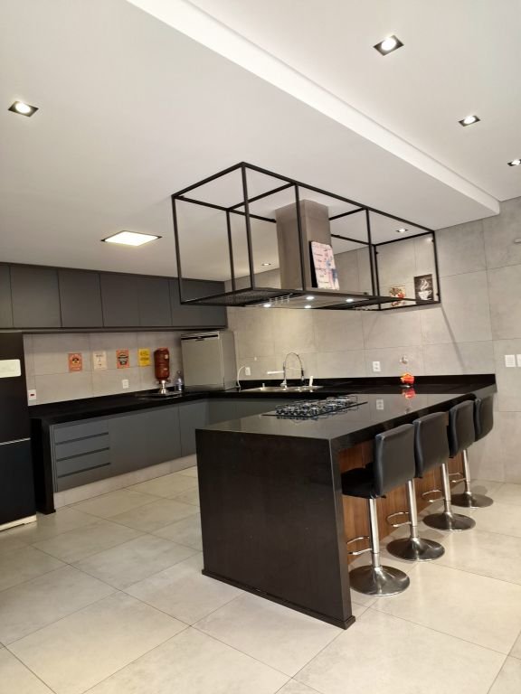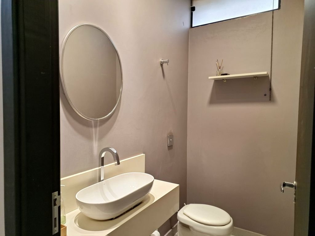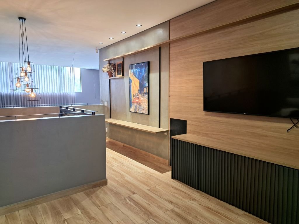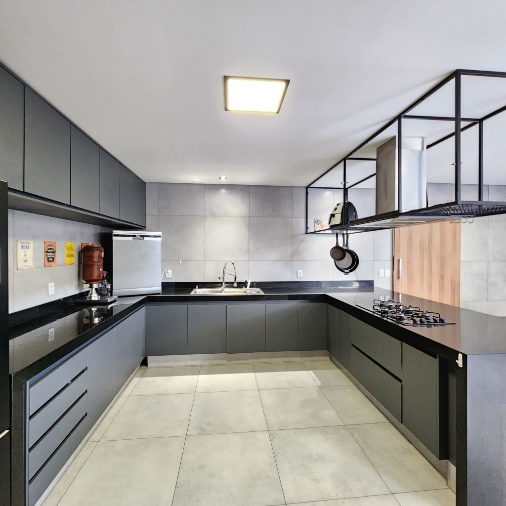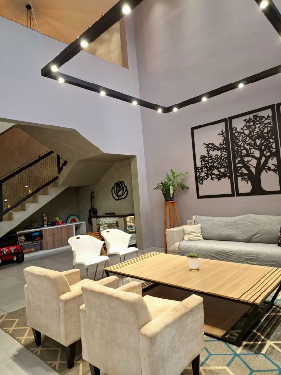 Parte inferior: Sala com pé direito alto com 6m de altura com teto em gesso e iluminação em led, lavabo, cozinha com armários, teto em gesso e iluminação em led, lavanderia com a/e, w.c serviço externo.